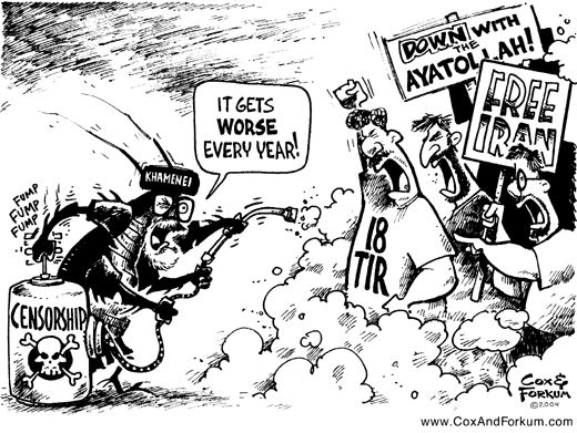 This cartoon was directly inspired by a quote in this AFP article from today: Iran Bans Commemorations of ’99 Unrest. (Iran Va Jahan)Iranian authorities signaled yesterday they had banned any commemorations marking this week’s fifth anniversary of violent student protests amid an effort to prevent a fresh outburst of anti-regime dissent. In comments carried in the Iranian press, the security affairs chief for Tehran, Ali Taala, said the Interior Ministry had decided to bar any gatherings and rejected a request for a student event outside Tehran University.