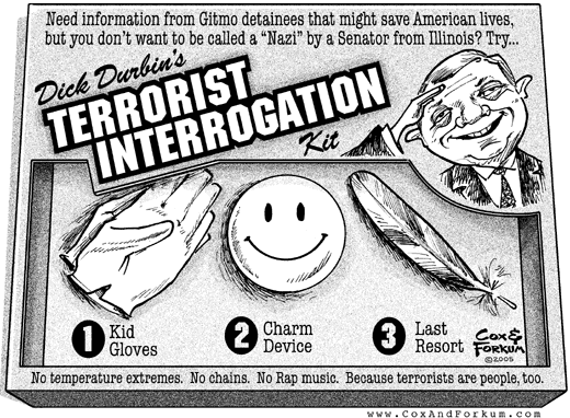 The White House and Senate Republicans on Thursday assailed a Democrat for comparing American interrogators at Guantanamo Bay to Nazis, Soviet gulags and Khmer Rouge leader Pol Pot. It is “beyond belief” that Illinois Sen. Dick Durbin would compare the treatment of dangerous enemy combatants at Guantanamo Bay to the death of millions of innocent people by oppressive governments, White House spokesman Scott McClellan said. … Defending himself, the Senate’s No. 2 Democrat said Thursday it was “just plain wrong” to say he was diminishing past horrors. He said he was comparing interrogation techniques that the FBI report said were used at Guantanamo with those in foreign detainee camps. … “If I read this to you and did not tell you that it was an FBI agent describing what Americans had done to prisoners in their control, you would most certainly believe this must have been done by Nazis, Soviets in their gulags, or some mad regime — Pol Pot or others — that had no concern for human beings,” Durbin said Tuesday.Michelle Malkin has many related links here, here, here, and here, including this one from the Los Angeles Times: We Are Our History — Don’t Forget It.