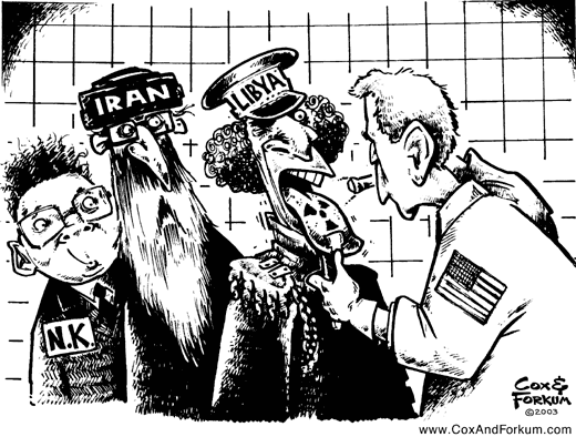 Foreign “assistance” from whom? Anyone from the “Axis of Weasels”? The report does not say.The U.S. intelligence statements on Libya’s alleged weapons programs suggest efforts in that country were not as advanced as Iraq’s were before the U.S.-led invasion. At the White House, Bush said the war in Iraq and efforts to stop North Korea’s nuclear program had sent a clear message to countries such as Libya that they must abandon weapons programs.“In word and in action, we have clarified the choices left to potential adversaries,” Bush said. That was an apparent reference to Iran and North Korea, two other countries that the United States contends are trying to develop weapons of mass destruction. Without naming them, Bush added: “I hope other leaders will find an example” in Libya’s action. [“Libya to Allow Weapons Inspections”, FoxNews, December 20, 2003]