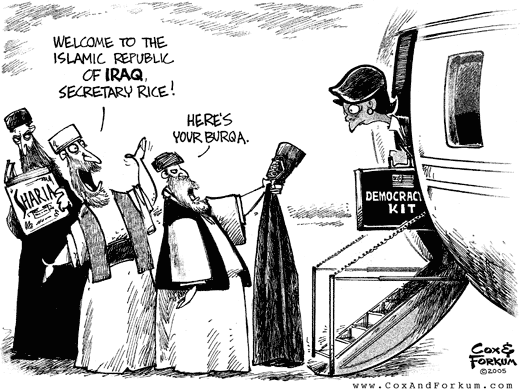 As Charles Johnson noted: "If Iraq does adopt the barbaric 14th century code of shari'a as the basis for their constitution, the terrorists truly will have won." For years we've been criticizing the Bush administration for allowing even the possibility of a fundamentalist Islamic state in Iraq. For example: Regime Change, Faith in Politics, Majority Rule?, Vote of Non-confidence, and Democracy Is. Contrary to reassurances from Colin Powell and Bush, some form of theocracy seems more and more likely.