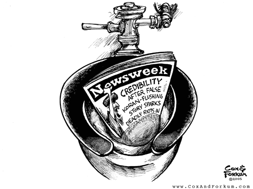 From Reuters (Via YahooNews): Newsweek says erred in Koran desecration report.Newsweek magazine on Sunday said it erred in a May 9 report that said U.S. interrogators desecrated the Koran at Guantanamo Bay, and apologized to the victims of deadly Muslim protests sparked by the article. ... [Editor Mark] Whitaker said the magazine inaccurately reported that U.S. military investigators had confirmed that personnel at the detention facility in Cuba had flushed the Koran down the toilet. The report sparked angry and violent protests across the Muslim world from Afghanistan, where 16 were killed and more than 100 injured, to Pakistan to Indonesia to Gaza.