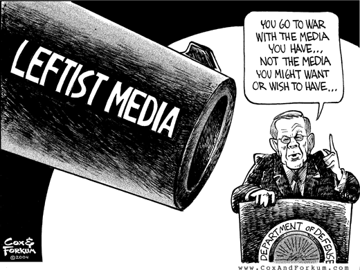 Nowhere was the media's irresponsibility on the Iraq conflict more acutely demonstrated than in the barrage of ugly news reports on Donald Rumsfeld's exchange in Kuwait with Spc. Thomas Wilson, an exchange that is still reverberating across the country. ... Virtually all the newspaper, magazine, radio, and TV accounts wildly misrepresented what happened next. As the Washington Post's Thomas Ricks "reported" -- and his piece was wholly representative of the media in general --" Rumsfeld replied: 'As you know, you go to war with the Army you have. They're not the Army you might want or wish to have at a later time." Rumsfeld, as the media would have it, was blowing off the deepest concerns of our men and women about to be placed in a deadly situation. ... But the official transcript of the Kuwaiti townhall meeting with the troops ... reveals an entirely different story. The first words out of Rumsfeld's mouth in response to Wilson were not what the media either said or implied or disclosed in film clips. They were, instead, words of encouragement. Rumsfeld dwelt at length on how much progress the military was making in solving the problem that began materializing a year ago August when the enemy started using explosives to blow up thin-skinned Army vehicles normally used in the rear of the combat zone. Nor was the secretary caught off guard by the question, as the media has suggested.The Wall Street Journal ran two good editorials on this subject this week: The first is by John R. Guardiano, an Arlington, Va.-based journalist who served in Iraq in 2003 as a field radio operator with the U.S. Marine Corps' Fourth Civil Affairs Group: Question Authority: What the media got wrong about Spc. Wilson and Secretary Rumsfeld.